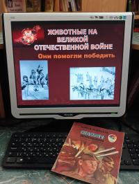 Великая война… Она живёт в фильмах, рассказах фронтовиков, фотографиях, письмах… и в сердцах… в книгах… В ходе мероприятия дети посмотрели презентацию «Животные на Великой Отечественной войне». Библиотекарь рассказала о животных, которые помогали солдатам в годы Великой Отечественной войны - собаках, лошадях, голубях, кошках и даже лосях и оленях.